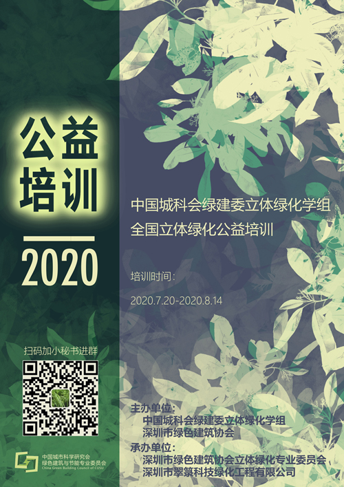 為更好推進該類建筑產(chǎn)品的發(fā)展,中國城科會綠建委立體綠化學(xué)組聯(lián)合深圳市綠色建筑協(xié)會、深圳市綠色建筑協(xié)會立體綠化專業(yè)委員會、深圳市翠箓科技綠化工程有限公司圍繞“立體綠化”這一綠色科技,于7月20日~8月14日舉辦2020年全國立體綠化公益培訓(xùn)活動。