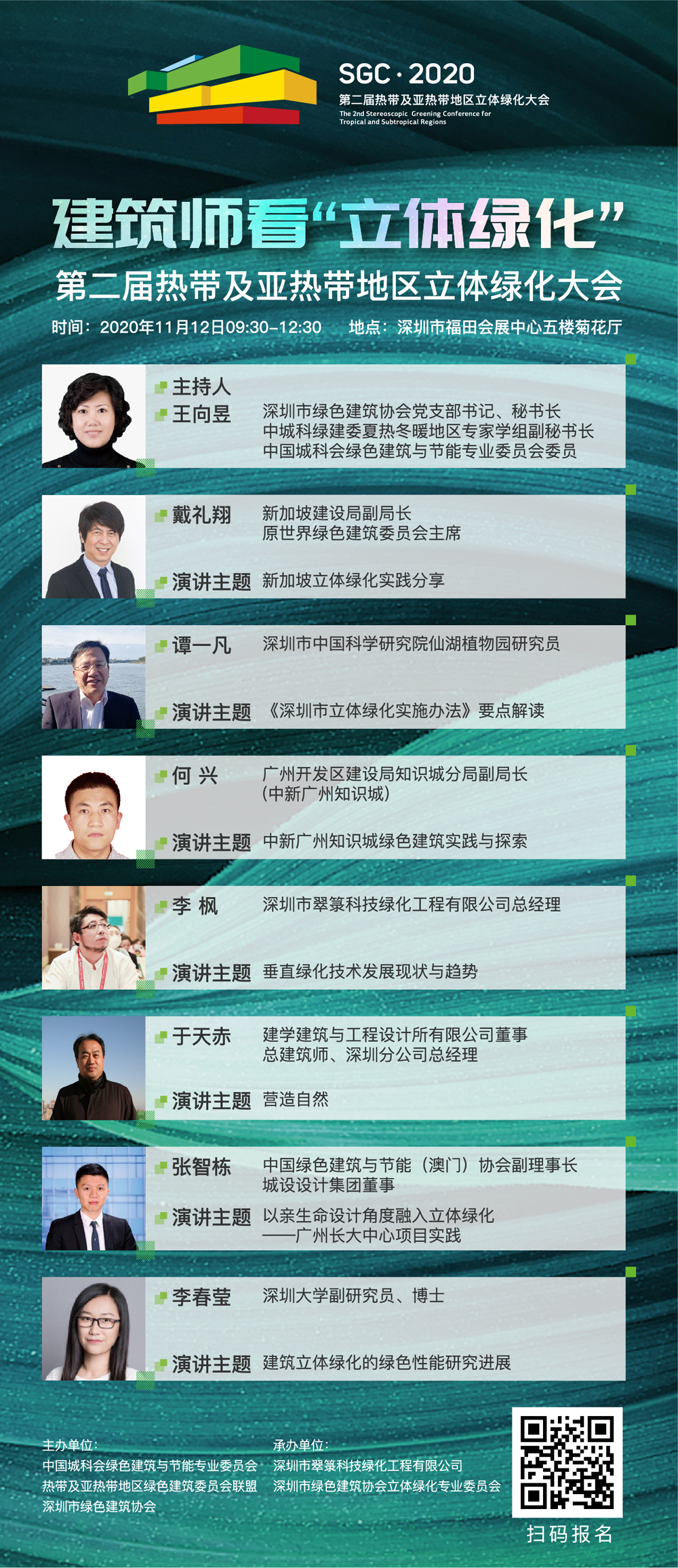 2020年11月12日,由中國(guó)城科會(huì)綠色建筑與節(jié)能專業(yè)委員會(huì)、熱帶及亞熱帶地區(qū)綠色建筑委員會(huì)聯(lián)盟與深圳市綠色建筑協(xié)會(huì)主辦、深圳市翠箓科技綠化工程有限公司、深圳市綠色建筑協(xié)會(huì)立體綠化專業(yè)委員會(huì)承辦的第二屆熱帶及亞熱帶地區(qū)立體綠化大會(huì)在深圳召開(kāi)。